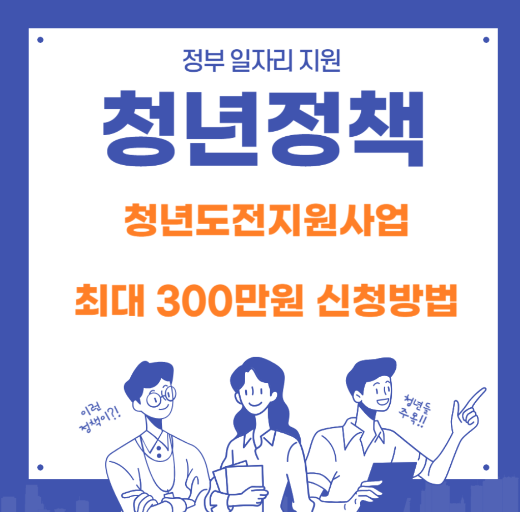 청년들의 성공적인 사회진출을 돕기위한 청년도전지원사업 최대 300만원의 인센티브를 받을수 있습니다. 위에 버튼을 통해 신청 자격 및 방법 그리고 구직단념청년 테스트등 자세한 내용을 확인하시고 최대 300만원의 지원금을 받아가세요!!